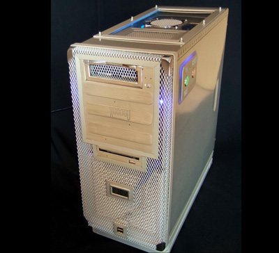 Технологический процесс разработки корпуса включал в себя снятие старой краски (точнее, того, что от нее осталось), выравнивание вмятин на верхней и боковых крышках корпуса, подготовка их к покраске путем нанесения нескольких слоев грунтовки. Затем умелец приступил к работе с передней панелью. Ее было решено сделать полностью из стальной сетки. Рамки в нише для 5,25-дюймовых устройств и USB-портов моддер окантовал алюминиевым уголком.