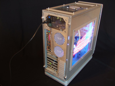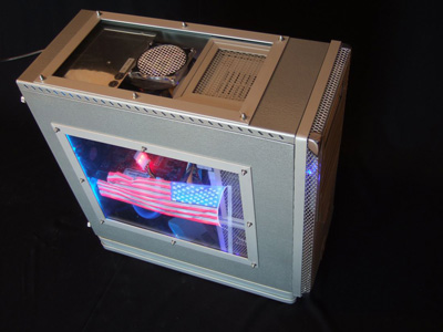 Верхняя панель также претерпела изменений, теперь в ней вырезано несколько отверстий, одно просто прикрыто сеткой, а в другом разместился 8-см вентилятор. Что касается боковых панелей, то на одной из них появилось небольшое окно, изюминкой которого является рисунок американского флага.
