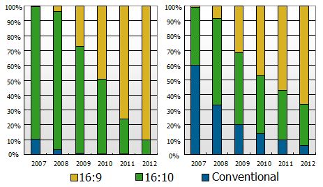 По прогнозам DisplaySearch, к 2012 году до 90% панелей ноутбуков и до 67 % мониторов будут иметь соотношения сторон экрана 16:9.