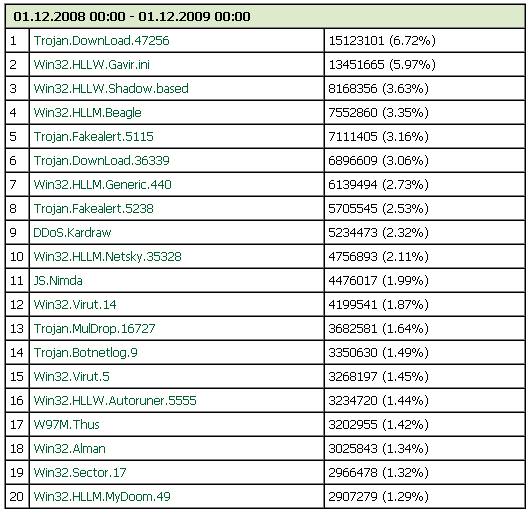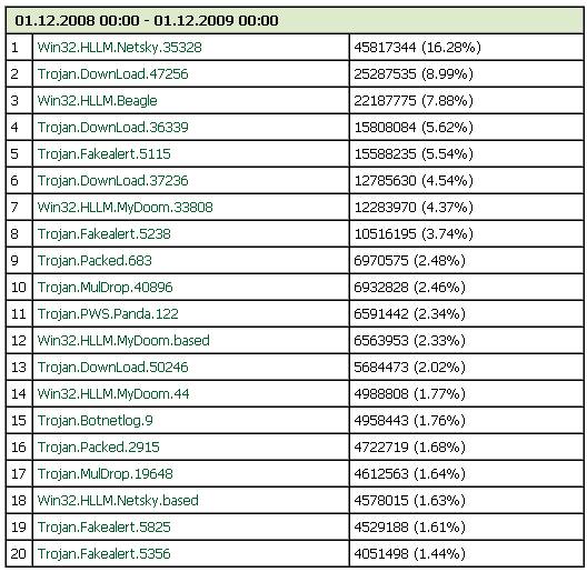Топ-20 вредоносных программ, обнаруженных в 2009 году в почтовом трафике