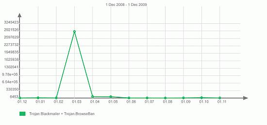 В марте 2009 года был замечен всплеск активности распространения вредоносных программ данного типа. Тогда было зафиксировано около 3 млн. определений Trojan.Blackmailer на компьютерах пользователей. В среднем же в течение года количество определений вредоносных браузерных баннеров держалось на уровне 5 000 – 10 000 в месяц.