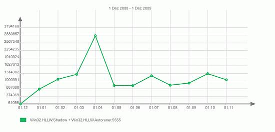 Как видно из графика, активное распространение Win32.HLLW.Shadow.based продолжается и сейчас. Данный сетевой червь продолжает своё своеобразное, но весьма эффективное обучение сетевых администраторов.