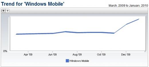 По данным декабрьских исследований аналитической компании Net Applications, за последний месяц 2009 года доля Windows Mobile выросла в два раза. В ноябре она составляла 0.04%, а в декабре уже 0.06%. Казалось, что успех этот временный, но январьские данные трафика множества сайтов доказали, что это не так. В первый месяц 2010 показатели WinMo достигли 0.07%, что поставило его на третье место. Лидерами так и остаются iPhone и Symbian. На этот раз Android остался позади, получив 0,06%. Blackberry и Palm остались на прежнем уровне, с показателями 0.03% и 0.01%, соответственно. Так что, вопреки прогнозам, Windows Mobile не только не ушел в тень, он продолжает стабильно укреплять свои позиции.